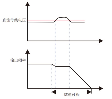 在减速过程中,当直流母线电压超过设定值时,会根据你选择的过压保护模式保护变频器。